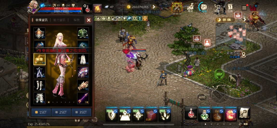 +9祝福騎士團弓(紅武)、+8祝福沙哈之弓(掛網神器)、+7祝福艾盔、+6祝福神官法袍、+6祝福鋼鐵長靴、+5祝福鐵門褲子、+6光之敏捷皮夾克、+6光之敏捷肩甲、+6祝福保護者斗篷、+2祝福體力臂甲、+5祝福挽甲