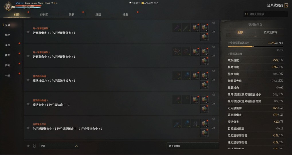 【刻印紅裝】: +5 祝福 地平線香爐 +2 祝福 裂痕之結晶耳環 +3祝福 神射耳環 +3 祝福 庫庫爾坎的戒指