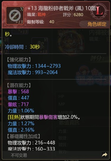 【50等】7.5狂戰/狂熱後物攻29255/首增40/4S飾品/可議/邊賣邊玩/霸王85%