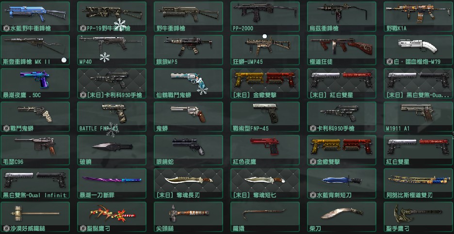 凜冬滅世·弗洛薩克(蛇神)、白金AK、紅色夜鶯、碧藍羽翼、星河崩裂V、末日開拓者V、赤蛇鎖鏈劍、浩劫法環、10周年武器、末日懷舊三件套、眾多塗料槍、多數王牌武器、黃金槍、收藏用玩具槍 等…如圖