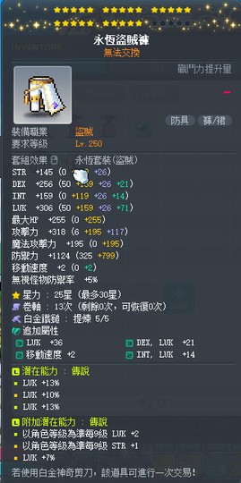 【永恆盜賊褲】雙傳25星36%幸永恆盜賊褲 附加+27幸大雙 白5全b~