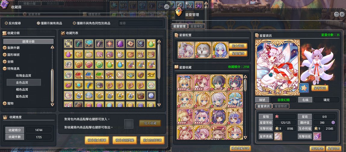 【收藏積分】14744 (伺服第六,平常可把會切換的星羽拿出來放背包,珍藏塞回可達17000up)