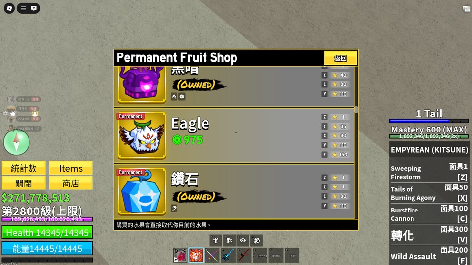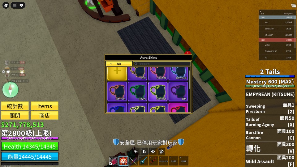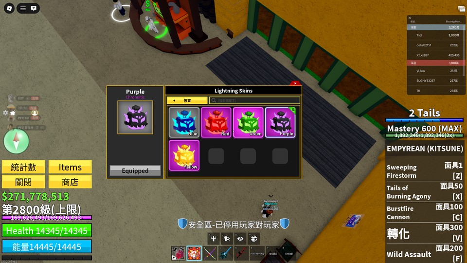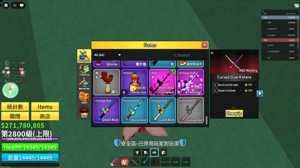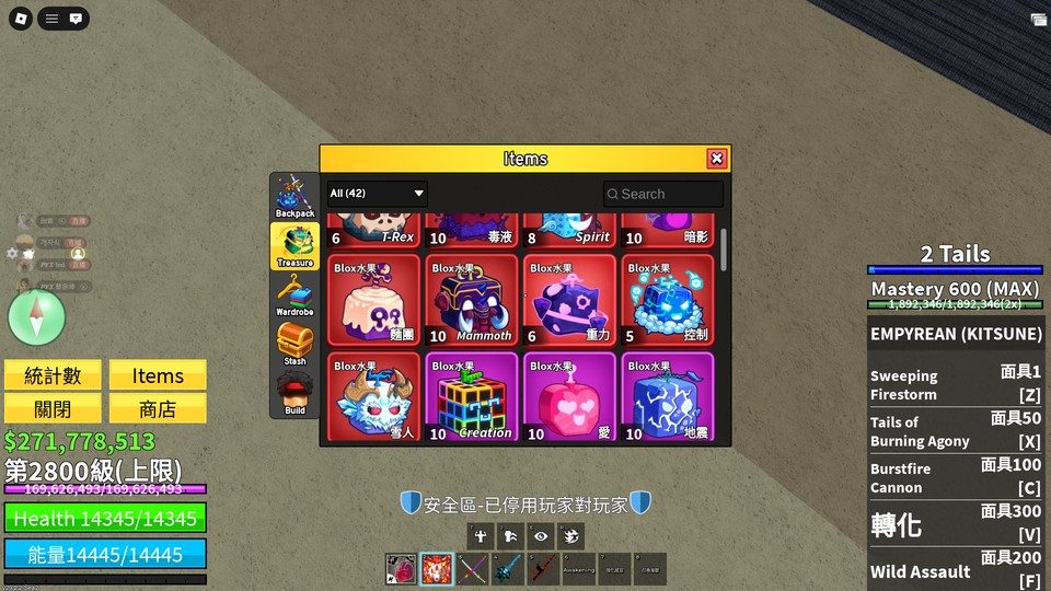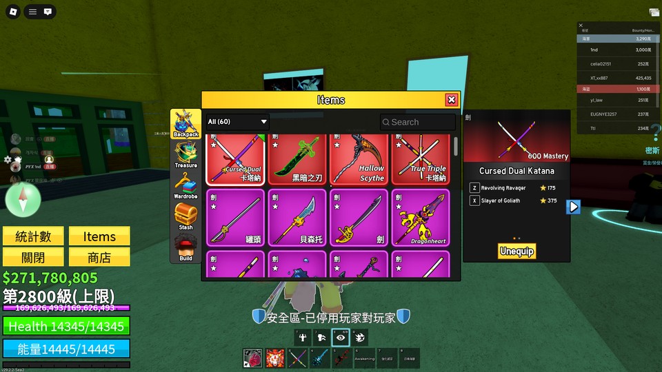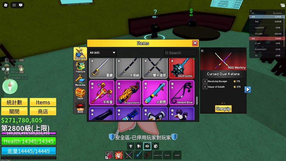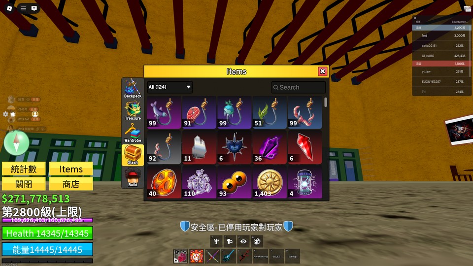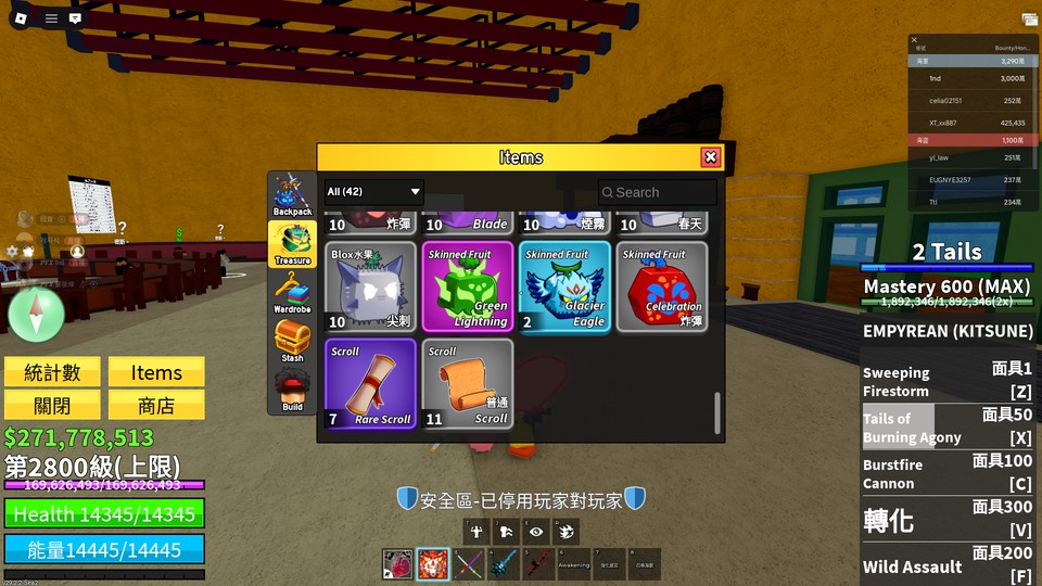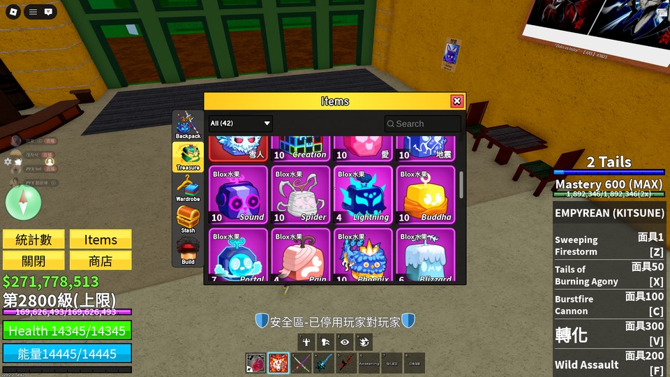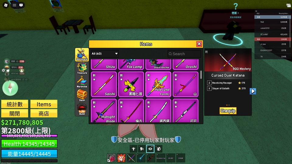 大部分刀、果實、拳法、槍都600精通全手動練等 多稀有絕版皮膚 剩餘2.7億現金 7萬F幣