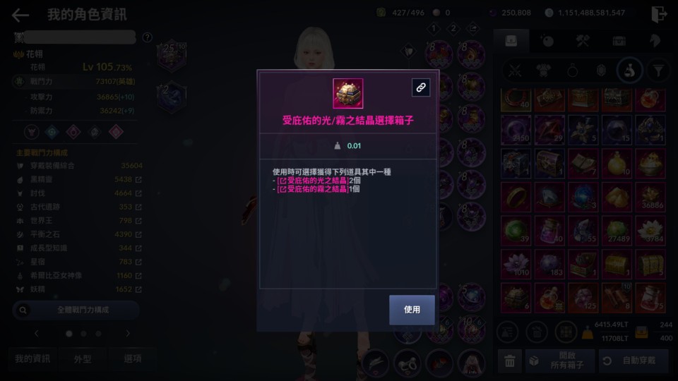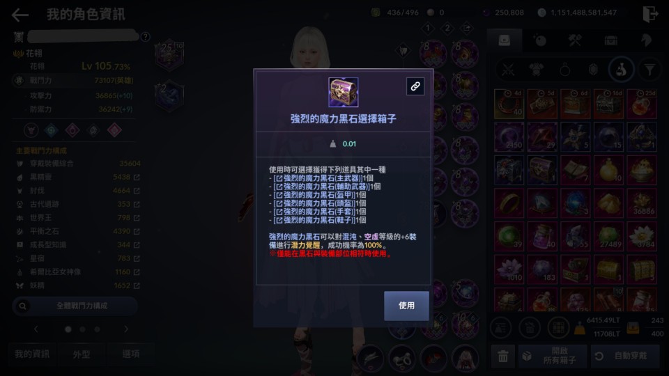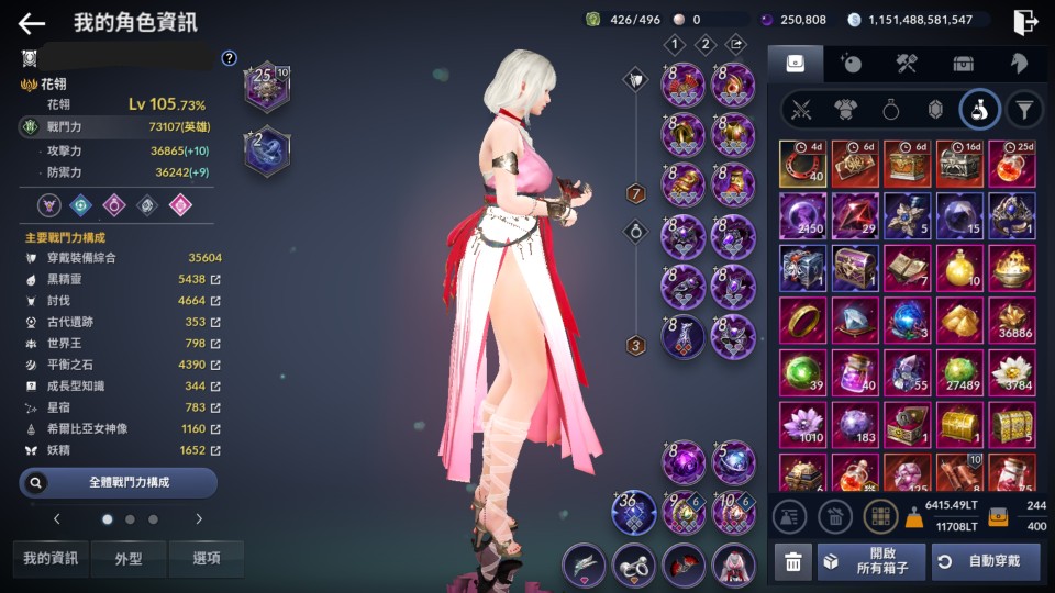 【105等】█花翎73100 25萬黑珠460萬復原券 +8空虛套裝/飾品 怪力戒 無限水L