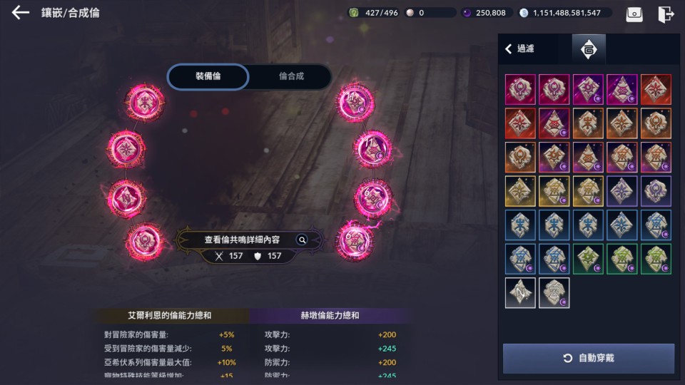 ●主角色武防裝備--- +8黎明主武器(空虛階級) / +8黎明輔助武器(空虛階級) / +8黎明頭盔(空虛階級) / +8黎明盔甲(空虛階級) / +8黎明鞋子(空虛階級) / +8黎明手套(空虛階級)(全太古記憶刻印 / 鑲嵌混沌水晶x29+空虛水晶x1 / 全魔力刻印滿,全+100攻擊/+100防禦_頂),+8空虛項鍊(已覺醒) / +8空虛戒指(已覺醒) / +8空虛耳環(已覺醒) / +8空虛腰帶(已覺醒) / +8空虛手鐲(已覺醒)(全太古記憶刻印 / 鑲嵌精緻的混沌水晶x14+空虛水晶x1 / 各部位飾品之魔力刻印_全+100攻擊/+100防禦_頂),黑精靈倫(全太古黑精靈倫, +11武力之倫 / +11鐵甲之倫 / +6能量之倫 / +6經驗之倫 / 戰爭之倫 / 意志之倫 / 阿爾之倫 / 同行之倫 ,套用第15個倫共鳴_頂),+36協調的煉金石(鑲嵌+10混沌煉金石:突破 & +10混沌煉金石:幸運 & +9混沌煉金石:激烈 & +9混沌煉金石:勇猛,仍保留大量資源給您自由彈性選擇要衝的煉金石),+9空虛拉夫利普文物 & +10空虛阿爾文物(全太古以上紋樣,其中鑲嵌 2張燦爛太古紋樣刻印書 + 2張太古紋樣刻印書 + 3張 混沌紋樣刻印書_+133頂攻/+71頂防 & 3張混沌紋樣刻印書 ; 系列突破分別為+6/+6),+25空虛的徽章,混沌光源石 (四種分別突破數值如圖所示;+14太古光源石=+0混沌光源石;+15太古光源石=+2混沌光源石;+16太古光源石=+4混沌光源石;製作介面可察看轉換,+15以上光源石才建議太古升為混沌,因可開箱取得),+2傳承之環 (混沌等級),+8渾沌的龜裂圖騰 (結合1個+8圖騰/2個+7圖騰),+8夜幕靈魂石/+5月光靈魂石