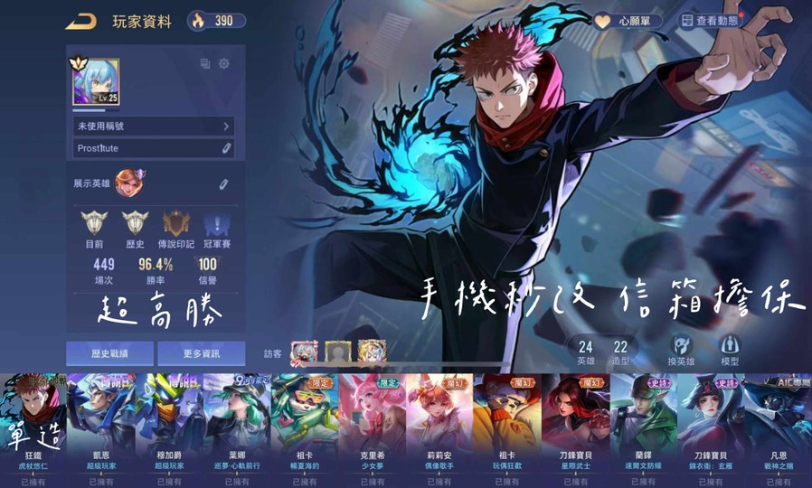 【Garena帳有綁定、鉑金、無VIP、24英、22造】超高勝率 手打 虎杖