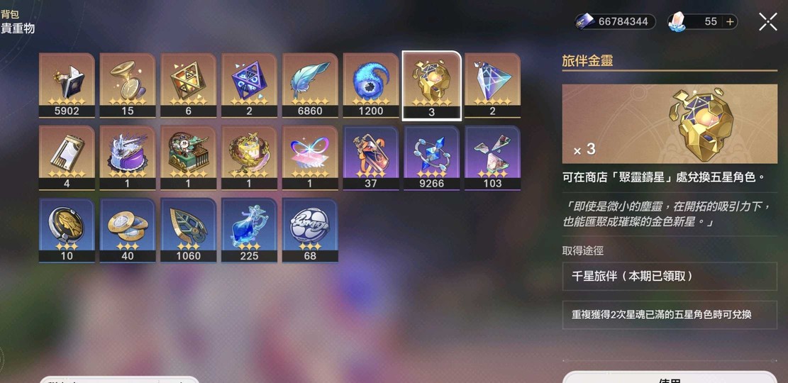 五星角色含星魂共62金(不含主角),旅伴金靈可再選3金共65金角色