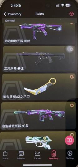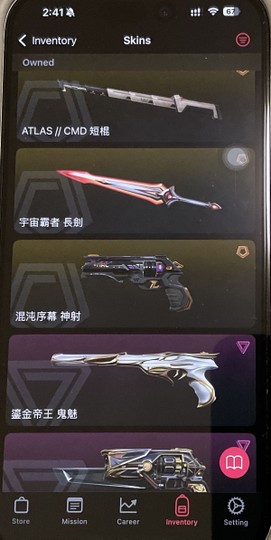 制式:prx、tec 鬼魅:鎏金 神射:末日 幻象:偵察 暴徒:魔岩、混沌、末日、晶矽 刀:煥然5週年刀、紫金爪