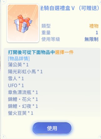 泡泡機坐騎自選禮盒V,蒲公英、小馬、雪人、UFO、章魚、錦鯉、營火豆,莎拉伺服器