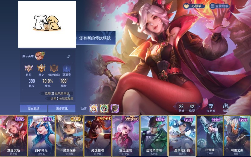 【Garena帳有綁定、先鋒傳說·新月、無VIP、28英、42造】勝率70% 歷史新月 主打魅影虎姬 飛鳶探春 紅蓮槍魂 價格可議 單信箱整組給
