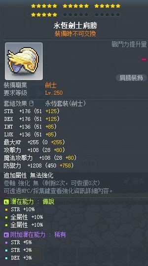 滿SET(7SET) 全20星(可自行選擇上22/23/25更加增強 但本人292等英雄 遊玩已足夠全通關 且永恆為終身裝備無需再次更換)
