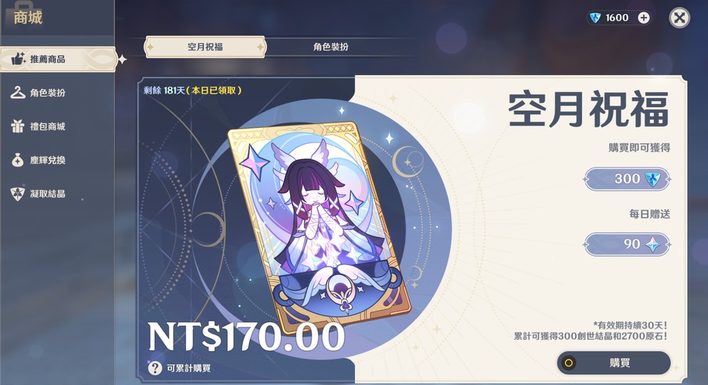 ✦ 時裝只少三件,小月卡還有181天(1/15起算)
