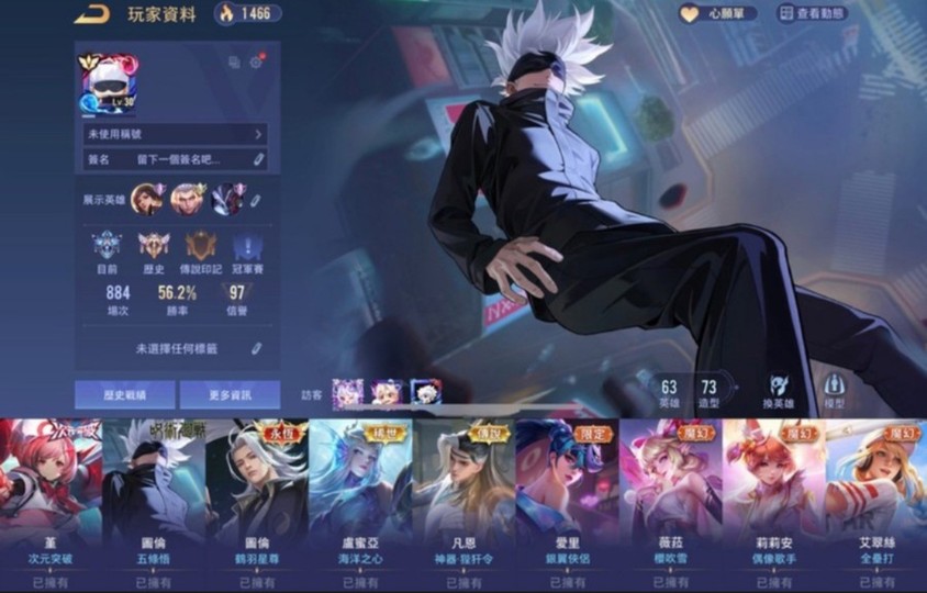 【Garena帳有綁定、鑽石、無VIP、63英、73造】堇次元 五條悟 鶴羽星尊