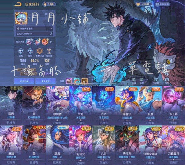 【Garena帳有綁定、鉑金、無VIP、53英、80造】千場94.7高勝🔥 伏黑惠全套🔥、釘崎全套🔥、鋼鐵戰線、古木冰雪、另月冰雪