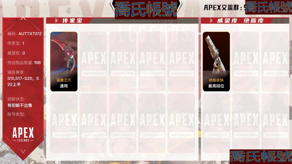 【OBAUTTX737242】白銀,521級 1傳家寶 168金, 300金幣,賽季滿級:S15賽季,S17賽季,S18賽季,S19賽季,S20賽季,S22上半賽季;傳家寶:通用-猛禽之爪,稀有皮膚:最高段位,自用小號,只出ae,繫結了其它賬號不出