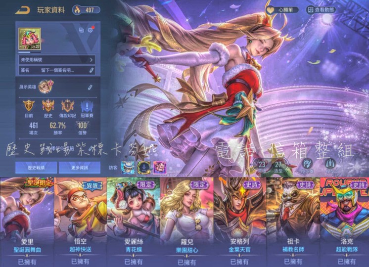 【Garena帳有綁定、鉑金、V3、23英、27造】聖誕愛理