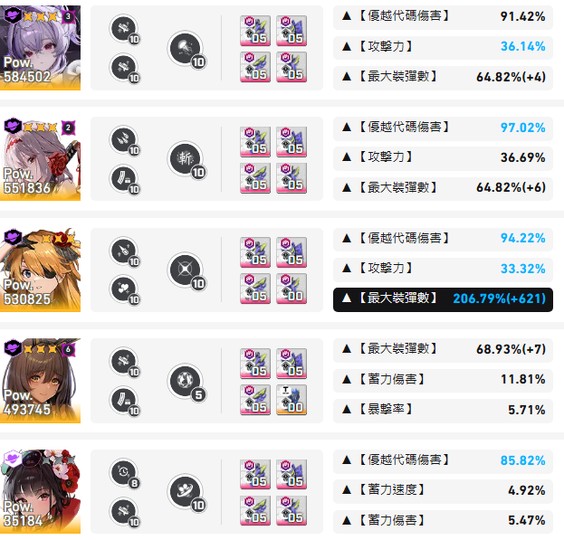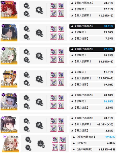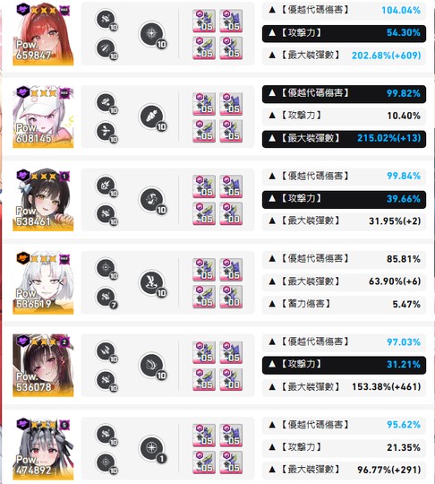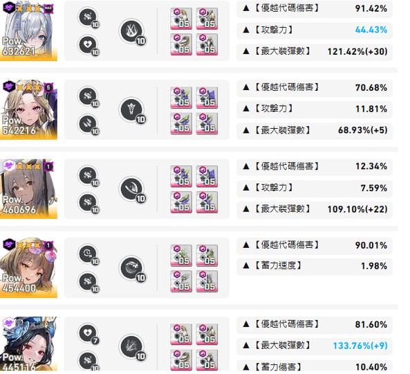 如圖,各屬性主要一線角色均有練度,沒有特別捲哪一屬性但都有均90~95代碼