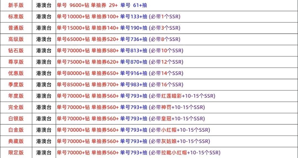 【新手版】 單號:9600+ 鑽 單抽券:29+ 單號抽數:61+ 抽 【標準版】 單號:10000+ 鑽 單抽券:100+ 單號抽數:133+ 抽 必帶 1 個 SSR 【普通版】 單號:15000+ 鑽 單抽券:140+ 單號抽數:190+ 抽 必帶 3 個 SSR 【高級版】 單號:65000+ 鑽 單抽券:520+ 單號抽數:736+ 抽 必帶 8 個 SSR 【鑽石版】 單號:70000+ 鑽 單抽券:580+ 單號抽數:813+ 抽 必帶 10 個 SSR 【尊享版】 單號:75000+ 鑽 單抽券:620+ 單號抽數:870+ 抽 必帶 12 個 SSR 【優惠版】 單號:80000+ 鑽 單抽券:650+ 單號抽數:916+ 抽 必帶 14 個 SSR 【季度版】 單號:85000+ 鑽 單抽券:700+ 單號抽數:983+ 抽 必帶 16 個 SSR 【年度版】 單號:70000+ 鑽 單抽券:560+ 單號抽數:793+ 抽 必帶 紅蓮暗影 + 10–15 個 SSR 【完全版】 單號:70000+ 鑽 單抽券:560+ 單號抽數:793+ 抽 必帶 神罰 + 10–15 個 SSR 【白銀版】 單號:70000+ 鑽 單抽券:560+ 單號抽數:793+ 抽 必帶 皇冠 + 10–15 個 SSR 【白金版】 單號:70000+ 鑽 單抽券:560+ 單號抽數:793+ 抽 必帶 小紅帽 + 10–15 個 SSR 【典藏版】 單號:70000+ 鑽 單抽券:560+ 営號抽數:793+ 抽 必帶 灰姑娘 + 10–15 個 SSR 【限定版】 單號:70000+ 鑽 單抽券:560+ 單號抽數:793+ 抽 必帶 拉毗小紅帽 + 10–15 個 SSR