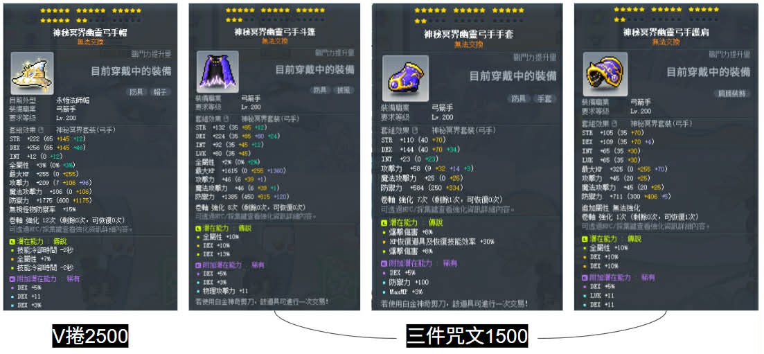 | 弓手防具 | 帽子 | 22 | 4CD7全 | 稀有(5+3%) | V捲 | 2500 |