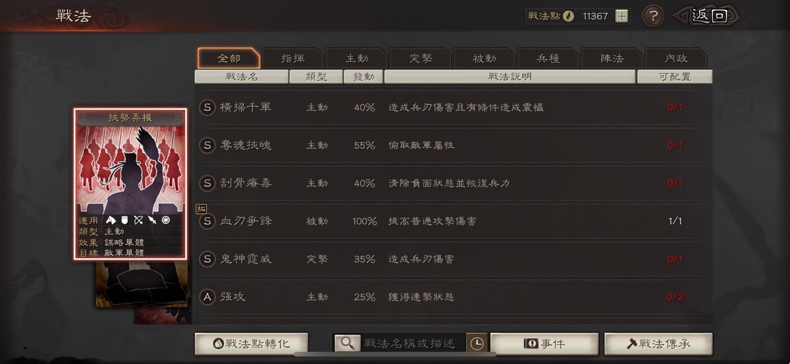 戰法:暫避 刮骨 暴戾 奪魂 橫掃 虎豹 一騎 鬼神