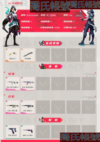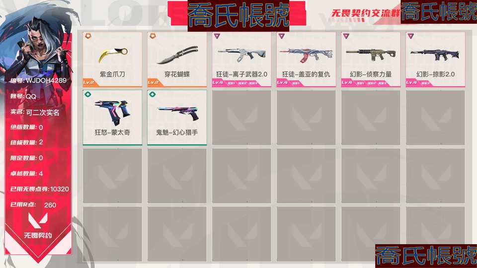 【OBWJDOH428942】Lv94 白銀III, 刀皮數量2,槍皮數量6(絕版0限定2終極0卓越4);皮膚資產價值10320,已用R點260;【刀皮】:近戰武器-紫金爪刀,近戰武器-穿花蝴蝶; 【槍皮】:狂徒-離子武器2.0,狂徒-蓋亞的復仇,幻影-偵察力量,幻影-掠影2.0,狂怒-蒙太奇,鬼魅-幻心獵手;【熱門卡面】:長夜未盡卡面,盡情舞動卡面,V25巴黎序曲卡面,終章戰術偶像團卡面,三重威脅卡面,5週年為何而戰卡面,禁滅工牌卡面,開拓者卡面,別冒尖卡面,我眼中的世界卡面,驚嚇戰術卡面,紅鱗松葉卡面,夜露vs不死鳥卡面,我見識過的恐懼卡面,5週年消滅源能者卡面,5週年薪火初燃卡面,歸鄉蝰蛇卡面,5週年卡面,親手縫製卡面,是不是哥們卡面,孤獨派對卡面,狂歡就現在卡面,熱身戰猖狂大麥寶卡面,完好陳列卡面,無垠星環卡面,雙城之戰金克絲卡面,樹懶大作戰卡面,新兵報到卡面,代號紅色卡面,V契約卡面,貴賓限行設計圖卡面,無畏契約卡面;【熱門掛飾】:機器人掛飾,電擊搖滾掛飾,V25第六幕紀念幣掛飾,盆栽掛飾,V25第四幕紀念幣掛飾,捏捏球掛飾,5週年掛飾,內測金鑰掛飾,歡樂餃子掛飾,V25第三幕紀念幣掛飾,誘捕陷阱掛飾,時空漂移掛飾,動力機箱掛飾,無畏契約紀念幣掛飾,V25第二幕紀念幣掛飾,神中神掛飾;【熱門噴漆】:奇樂噴漆,別惹我噴漆,變數已移除噴漆,技能裡面洗澡噴漆,身負重任噴漆,高歌一曲噴漆,五週年快樂噴漆,風暴湧動噴漆,蛇出沒注意噴漆,這可教不了噴漆,松葉噴漆,超時空衛隊噴漆,酥脆一擊噴漆,暗中觀察噴漆,5週年噴漆,幸運小虎噴漆,電音光譜噴漆,囊中羞澀噴漆,閱後即焚噴漆,放下武器噴漆,蠢萌大眼噴漆,勝利屬於無畏契約噴漆,GLHF噴漆,無畏契約噴漆;【皮膚可能含有某些特權皮膚,具體以遊戲內實際擁有為準】