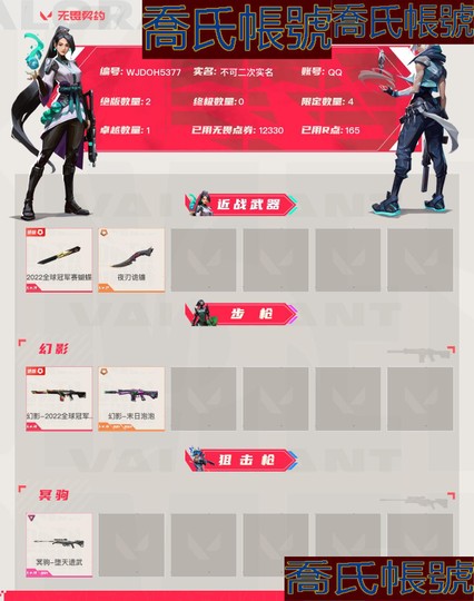 【OBWJDOH537742】Lv27 青銅I, 刀皮數量2,槍皮數量3(絕版2限定4終極0卓越1);皮膚資產價值12330,已用R點165;【刀皮】:近戰武器-2022全球冠軍賽蝴蝶刀,近戰武器-夜刃詭鐮; 【槍皮】:幻影-2022全球冠軍賽,幻影-末日泡泡,冥駒-墮天遺武;【熱門卡面】:畫素瞬間深海明珠卡面,激鬥漢堡卡面,兔兔攻擊卡面,盡情舞動卡面,V25巴黎序曲卡面,禁滅工牌卡面,5週年掌控全域性卡面,再火一回卡面,身陷蝰腹卡面,大軍“鴨”境卡面,第四季破局時刻卡面,我眼中的世界卡面,我見識過的恐懼卡面,雙城之戰金克絲卡面,5週年薪火初燃卡面,裂變峽谷行動卡面,5週年卡面,親手縫製卡面,是不是哥們卡面,孤獨派對卡面,2022全球冠軍賽卡面,狂歡就現在卡面,新兵報到卡面,代號紅色卡面,V契約卡面,貴賓限行設計圖卡面,無畏契約卡面;【熱門掛飾】:V25第六幕紀念幣掛飾,無人之境掛飾,致命劑量掛飾,V25第五幕紀念幣掛飾,新型引擎掛飾,內測金鑰掛飾,2022全球冠軍賽掛飾,5週年掛飾,V25第三幕紀念幣掛飾,無畏契約紀念幣掛飾,神中神掛飾;【熱門噴漆】:別擋我的路噴漆,放下武器噴漆,松葉噴漆,智商200噴漆,紅鱗噴漆,尷尬時刻噴漆,商業間諜噴漆,無人之境噴漆,風暴湧動噴漆,鬱悶刷屏噴漆,扭蛋機噴漆,熱血澎湃噴漆,想得美噴漆,技能裡面洗澡噴漆,身負重任噴漆,高歌一曲噴漆,鴨鴨聽命噴漆,碰個拳噴漆,2022全球冠軍賽噴漆,5週年噴漆,勝利屬於無畏契約噴漆,GLHF噴漆,無畏契約噴漆;【皮膚可能含有某些特權皮膚,具體以遊戲內實際擁有為準】