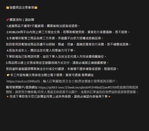 2.ROBLOX與平台內禁止第三方現金交易,若導致帳號受限,買家自行承擔風險,恕不退款。