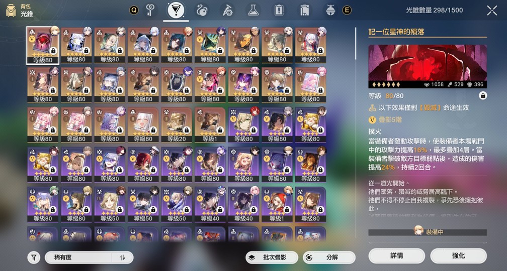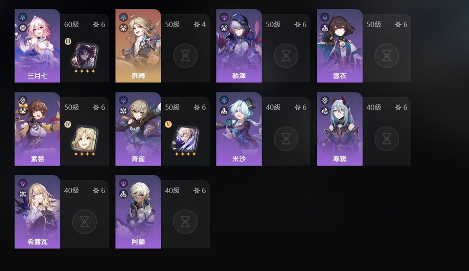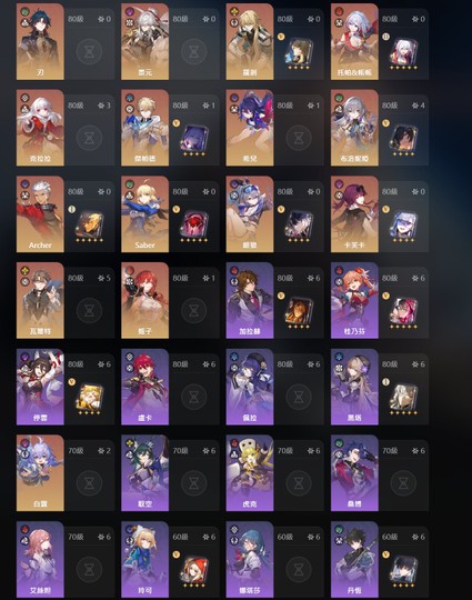 角色詳情請參考附圖,如果不追求強度,想體驗多角色、流派可以考慮此帳號。