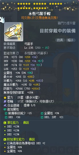 【永恆弓箭手帽】雙傳25星39%敏永恆弓手帽 附加+266大三排 白5全b卷 可直下