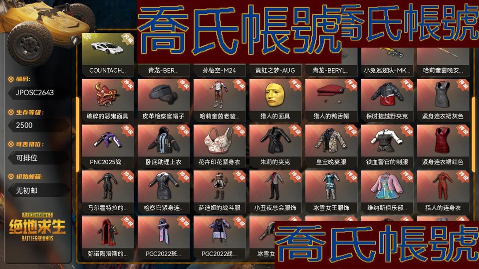 【OBJPOSC264342】生存等級2500;異色皮膚1;成長型武器4;槍皮240;載具40;熱門物品:PGC2021群雄逐鹿面具;異色皮膚:青龍-BERYLM762藍綠色配金色;成長型角色:1級瀚娜;成長型武器:LV10孫悟空-M24,LV10霓虹之夢-AUG,LV8青龍-BERYLM762,LV1小兔巡邏隊-MK12;傳說武器:青龍-BERYLM762,霓虹之夢-AUG,小兔巡邏隊-MK12,孫悟空-M24,哈莉奎茵晚安棒球棒;傳說時裝:破碎的惡鬼面具,皮革檢察官帽子,哈莉奎茵老爸的小怪物服飾,獵人的面具,獵人的鴨舌帽,保時捷越野夾克,緊身連衣裙灰色,PNC2025戰術科技上衣,臥底助理上衣,花卉印花緊身衣,朱莉的夾克,皇室晚宴服,鐵血警官的制服,緊身連衣裙紅色,馬爾霍特拉的夜行服,檢察官緊身連衣裙,薩迪婭的戰鬥服,小丑夜總會服飾,冰雪女王服飾,維納斯俱樂部服飾,獵人的連身衣,彌諾陶洛斯的夾克,PGC2022斑斕危機披風,PGC2022戰術科技夾克,冰雪女王夾克,朱莉的潛行者夾克,獵人的外套,保時捷越野運動長褲,臥底助理下裝,格紋裙法蘭絨灰,花卉印花裙,迷霧追蹤者短褲,狂熱追隨者短靴,精緻鞋與絲襪黑色,絲襪與校園風鞋子黑色,檢察官絲襪與靴子,獵人的皮鞋;載具:COUNTACHLPI800-4跑車,DBX707SUV,邁凱倫GT版跑車,捕食者小型摩托車,公路戰士恣馬,鄉村巴士迷你巴士,8號賽手摩託艇,URUSSSUV,逃亡SUV,幫派SUV,邁凱倫GT標準版-瑪瑙黑跑車,彩繪髏摩托車,鳳皇來儀摩托車,鏽色反叛者摩托車,鼓舞伴我行山地腳踏車,逐夢者摩托車,雙龍會摩托車,PCS4黃金氣魄摩托車,小兔快遞配送員小型摩托車,加塔爾越野賽越野摩托車,PCS3烙印烏阿斯吉普車,絕塵時刻庫佩RB,親吻太陽烏阿斯吉普車,金色烈焰達西亞轎車,煉獄之角雙人越野車,寒冬勇士雙人越野車,彩虹四溢達西亞轎車,為你瘋狂庫佩RB,間諜軟體烏阿斯吉普車,彈球機雙人越野車,魔力甜心薩莉兩棲裝甲車,毒蛇獵手兩棲裝甲車,專業守衛烏阿斯吉普車,彩色標記達西亞轎車,計程車達西亞轎車,PCS7烏阿斯吉普車,賽季10競技肌肉跑車,雪機騎手雪地摩托,賽季9競技動力滑翔機;史詩武器:餘音環繞-ACE32,自動化咒文-QBZ,青龍之靈-ACE32,小兔巡邏隊-M416,彩虹之上-K2,鍍金-AKM,分秒必爭-M416,愉悅的綠松色-M16A4,PNC2025戰術科技-SKS,PGC2023皇冠寶石MK12,PGC2022王牌登場-SLR,瓦爾哈拉-SLR,青花之力-MINI14,猩紅漫彩-德拉貢諾夫,霓虹之夢-MINI14,美杜莎-KAR98K,鍍金槍兒響叮噹-KAR98K,愉悅的綠松色-KAR98K,珍珠王朝-AWM,PNC2025戰術科技-MP5K,一擊撕裂者-S1897,彌諾陶洛斯-DBS,鍍金-S12K,aespa-平底鍋,猩紅復仇之劍,藍色魔法迷霧-M79,紫色魔法迷霧-M79,深紅狂怒之霧-M79,乳白狂怒之霧-M79,珊瑚色煙霧彈,紫色煙霧彈;史詩時裝:監控人頭套,特種女電視人頭套,萬壽菊狂歡發帶,亡靈律動帽子,釉彩甜甜圈面具,月光遊牧者耳環,狂野姿態耳環,PNC2025戰術科技護目鏡,惡魔僕從椅角,臥底助理眼鏡,日光下澈墨鏡,豹子精漁夫帽,豹子精面具,九尾狐面具,般若面具,時光探員帽,革面悍匪面具,冬季拉拉隊皮草帽,PGC2023女皇的帽子,PGC2023女皇的金色面具,皇室摔跤手面具,PGC2021金墨點染鴨舌帽,PGC2021群雄逐鹿面具,彌諾陶洛斯的面具,彌諾陶洛斯的全耳式耳環,聖誕之子針織帽,冬夢女孩針織帽,冰雪天使王冠,PNC2023開拓者墨鏡,PGC2019頭飾,PGC2019眼鏡,朱莉的墨鏡,鐵血警官的面罩,PCS2隱形生存者面巾,冰雪女王護目鏡,PGC2022斑斕危機墨鏡,末世面罩,極限追逐者面具,位元組意志面具,卡通襲擊者針織帽,PGC2022戰術科技面罩,沙悟淨的面具,孫悟空的墨鏡,榮都學者眼鏡,劫掠者面具,幸運怪盜面具,絲襪頭套,黑猩猩頭套,玄武眼鏡,雪色美人耳環,雪色美人帽,棉花蕾絲絨帽,沙漠騙徒護目鏡,狂熱追隨者上衣,午夜祭典上衣,萬壽菊狂歡連衣裙,甜甜圈上衣,釉彩甜甜圈襯衫,月光遊牧者上衣,聚星女士的服飾,THELAST運動背心,PGC2021金墨點染皮質連衣裙,惡魔僕從馬甲,絲滑夏日上衣橄欖綠,絲滑夏日上衣白色,日光下澈熱帶上衣,日光下澈叢林上衣,九尾狐服飾,般若服飾,黃銅鳥嘴醫生夾克,時光探員裙,小隊隊長連衣裙,冬季拉拉隊上衣,PGC2023女皇的馬甲,皇室摔跤手上衣,蘭博基尼傳奇賽車服,PGC2021金墨點染襯衫,彌諾陶洛斯的T恤,PGC2022斑斕危機上衣,聖誕之子夾克,冬夢女孩T恤,冰雪天使連衣裙,維娜託水手衫,朱莉的褐灣制服,藍鯊寶寶連身睡衣,粉鯊寶寶連身睡衣,無重力中型上衣,PCS2競爭者連帽衛衣,速度與憤怒上衣,末世裝束,賽博生存者上衣,朋克預備生毛衣,PGC2022戰術科技上衣,沙悟淨的長袖T恤,孫悟空的上衣,龍之女皇服飾,巨龍之母服飾,禁忌閃光旗袍,蓄勢待發旗袍,阿斯頓馬丁夾克,劫掠者洋裙,雪片馬甲,雪色美人連衣裙,騎師夾克,沙漠騙徒上衣,亡靈律動夾克,惡魔僕從夾克,革面悍匪夾克,PGC2023女皇的外套,神槍手戰術護肩外套,PGC2021群雄逐鹿風衣,迷霧追蹤者夾克,冬夢女孩高領毛衣,PGC2019戰術連帽衛衣,位元組意志夾克,沙悟淨的夾克,孫悟空的夾克,禁忌閃光夾克,大麻煩夾克綠色,雪片夾克,無袖車手夾克棕色,沙漠騙徒風衣,狂熱追隨者短裙,紐扣牛仔短褲,沙灘寶貝短褲,PNC2025戰術科技長褲,惡魔僕從長褲,日光下澈熱帶短褲,日光下澈叢林短褲,PGC2023女皇的吊襪帶,PGC2021金墨點染長褲,彌諾陶洛斯的長褲,PGC2022斑斕危機長褲,冬夢女孩短褲,維娜託短裙,PGC2019戰鬥長褲,無重力中型長褲,末世長褲,賽博生存者長褲,PGC2022戰術科技長褲,沙悟淨的短褲,孫悟空的長褲,鐵血警官的短裙,正統朋克短褲,皇室雙腰帶鉛筆裙,沙漠騙徒長褲,保時捷越野運動鞋,狂野姿態