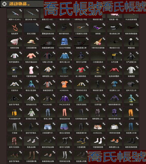 【OBJILIS471642】生存等級1366;異色皮膚5;成長型武器15;槍皮101;載具47;熱門物品:PGC2021群雄逐鹿面具,耳機漁夫帽;異色皮膚:豬八戒-M416藍綠色配橙色,無訊號-M416黃色配黑色,妖魔之觸-ACE32黃色配藍綠色,彌諾陶洛斯-AUG灰色配棕褐色,無訊號-M416紫色配木炭色;成長型角色:1級瀚娜;成長型武器:LV10妖魔之觸-ACE32,LV10美杜莎-BERYLM762,LV10彌諾陶洛斯-AUG,LV10無訊號-M416,LV5午夜驚魂-KAR98K,LV2塞壬·平底鍋,LV2無重力-MP5K,LV2唐三藏-平底鍋,LV1G-DRAGON-AUG,LV1魔咒之力-MK12,LV1刻耳柏洛斯-M249,LV1粉夢長眠-德拉貢諾夫,LV1豬八戒-M416,LV1危險玩偶屋-SLR,LV1猛虎獵手-KAR98K;傳說武器:豬八戒-M416,PCS2金色成就-BERYLM762,G-DRAGON-AUG,妖魔之觸-ACE32,美杜莎-BERYLM762,彌諾陶洛斯-AUG,暗影纏身-AKM,無訊號-M416,危險玩偶屋-SLR,魔咒之力-MK12,粉夢長眠-德拉貢諾夫,午夜驚魂-KAR98K,猛虎獵手-KAR98K,無重力-MP5K,刻耳柏洛斯-M249,塞壬-平底鍋,唐三藏-平底鍋;傳說時裝:皮革檢察官帽子,G-DRAGON的舞臺王冠,G-DRAGON的舞臺墨鏡,破碎的惡鬼面具,獵人的面具,獵人的鴨舌帽,PUBGXNEWJEANSHANNI的無邊帽,保時捷越野夾克,G-DRAGON的舞臺服,G-DRAGON的PEACEMINUSONE服飾,PNC2025全力出擊夾克,PNC2025戰術科技上衣,NINGNING的服飾,GISELLE的裙子,馬爾霍特拉的夜行服,緊身連衣裙灰色,獵人的連身衣,美杜莎的上衣,維納斯俱樂部服飾,PUBGXNEWJEANSHANNI的服飾,朱莉的防塵外套,棕熊獵人外套,獵人的外套,PGC2022戰術科技夾克,PGC2022斑斕危機披風,花卉印花裙,保時捷越野運動長褲,迷霧追蹤者短褲,美杜莎的長褲,格紋裙法蘭絨灰,G-DRAGON的舞臺鞋,G-DRAGON的短靴,NINGNING的靴子,GISELLE的靴子,絲襪與校園風鞋子黑色,檢察官絲襪與靴子,獵人的皮鞋,PUBGXNEWJEANSHANNI的短靴;載具:911CARRERAGTS跑車,CHIRON跑車,貓咪撓摩托車,捕食者小型摩托車,賽車條紋肌肉跑車,PCS2戰術扭矩雙人越野車,恐龍樂園達西亞轎車,鄉村巴士迷你巴士,公路戰士恣馬,8號賽手摩託艇,逃亡SUV,URUSSSUV,G-DRAGON肌肉跑車,神聖獨角獸摩托車,縫縫補補小型摩托車,小兔快遞配送員小型摩托車,彩繪髏摩托車,芳心女獵手山地腳踏車,鏽色反叛者摩托車,鼓舞伴我行山地腳踏車,怪盜小兔摩托車,鳳皇來儀摩托車,雙龍會摩托車,逐夢者摩托車,PCS4黃金氣魄摩托車,聖誕快樂烏阿斯吉普車,泰索尼克達西亞轎車,暗夜捕食者烏阿斯吉普車,為你瘋狂庫佩RB,律動甜甜圈雙人越野車,PCS3烙印烏阿斯吉普車,碰撞測試皮卡車,親吻太陽烏阿斯吉普車,毒蛇獵手兩棲裝甲車,煉獄之角雙人越野車,畫素風大冒險羅尼,彈球機雙人越野車,間諜軟體烏阿斯吉普車,銀河小隊漫遊者雙人越野車,計程車達西亞轎車,寒冬勇士雙人越野車,魔力甜心薩莉兩棲裝甲車,角鯊隊隊車迷你巴士,彩虹四溢達西亞轎車,飛得更高動力滑翔機,海洋幻想摩託艇,嬉皮士之魂摩託艇;史詩武器:PNC2025全力出擊SCAR-L,aespa-AKM,小兔巡邏隊-M416,破碎元素-AKM,黃金齒輪-BERYLM762,PNC2025戰術科技-SKS,aespa-MINI14,賽博危機-SLR,美杜莎-KAR98K,珍珠王朝-AWM,PNC2023完美角度KAR98K,PNC2025戰術科技MP5K,無訊號-S12K,一擊撕裂者-S1897,G-DRAGON-平底鍋,碎瓜者-平底鍋,PNC2025全力出擊-平底鍋,aespa-平底鍋,切割狂潮-平底鍋,橙色狂怒之霧-M79,翡翠色煙霧彈,品紅色煙霧彈;史詩時裝:雪域面罩,萬壽菊狂歡發帶,監控人頭套,特種女電視人頭套,沙漠騙徒護目鏡,亡靈律動帽子,釉彩甜甜圈面具,PGC2021金墨點染鴨舌帽,車手面具黑色,PGC2019眼鏡,PNC2025全力出擊耳麥,PNC2025全力出擊護目鏡,PNC2025戰術科技護目鏡,日光下澈墨鏡,黑猩猩頭套,皇室摔跤手面具,PGC2023女皇的帽子,PGC2023女皇的金色面具,惡魔騎手面罩,惡魔騎手椅角,絲襪頭套,極限追逐者面具,豹子精漁夫帽,豹子精面具,九尾狐面具,般若面具,革面悍匪面具,時光探員帽,位元組意志面具,冬季拉拉隊皮草帽,榮都學者眼鏡,廢土未來面罩,美杜莎的面具,美杜莎的耳環,PGC2021群雄逐鹿面具,塞壬的頭飾,卡通襲擊者針織帽,聖誕之子針織帽,冰雪天使王冠,冬夢女孩針織帽,人類獵手鴨舌帽,人類獵手制服,PCS2隱形生存者面巾,雪色美人帽,雪色美人耳環,朱莉的墨鏡,PGC2023帝皇的荊棘面具,劫掠者面具,PGC2022戰術科技面罩,棉花蕾絲絨帽,沙灘作戰部隊水桶,PGC2022斑斕危機墨鏡,PNC2023開拓者墨鏡,幸運怪盜面具,THELAST運動背心,雪域夾克,午夜祭典上衣,萬壽菊狂歡連衣裙,暴躁花生連帽衛衣,釉彩甜甜圈襯衫,PGC2022斑斕危機上衣,日光下澈熱帶上衣,日光下澈叢林上衣,大麻煩胸衣,PGC2023女皇的馬甲,巨龍之母服飾,PGC2023帝皇的風衣,九尾狐服飾,般若服飾,黃銅鳥嘴醫生夾克,時光探員裙,小隊隊長連衣裙,冬季拉拉隊上衣,廢土未來上衣,聚星女士的服飾,迷霧追蹤者上衣,皇室摔跤手上衣,禁忌閃光旗袍,塞壬的裙子,騎師夾克,聖誕之子夾克,薩迪婭的婚紗,冰雪天使連衣裙,冬夢女孩T恤,沙漠騙徒上衣,雪片馬甲,朱莉的上衣,雪色美人連衣裙,PNC2023開拓者上衣,藍鯊寶寶連身睡衣,粉鯊寶寶連身睡衣,沙灘寶貝操作員上衣,無重力中型上衣,劫掠者洋裙,PGC2022戰術科技上衣,PCS2競爭者連帽衛衣,PGC2021金墨點染皮質連衣裙,亡靈律動夾克,大麻煩夾克綠色,PGC2023女皇的外套,革面悍匪夾克,PGC2019戰術連帽衛衣,位元組意志夾克,廢土未來夾克,神槍手戰術護肩外套,冬夢女孩高領毛衣,雪片夾克,PNC2023強襲者夾克,冰魔長褲,紐扣牛仔短褲,PNC2025全力出擊長褲,PNC2025戰術科技長褲,日光下澈熱帶短褲,日光下澈叢林短褲,朱莉的長褲,PGC2023女皇的吊襪