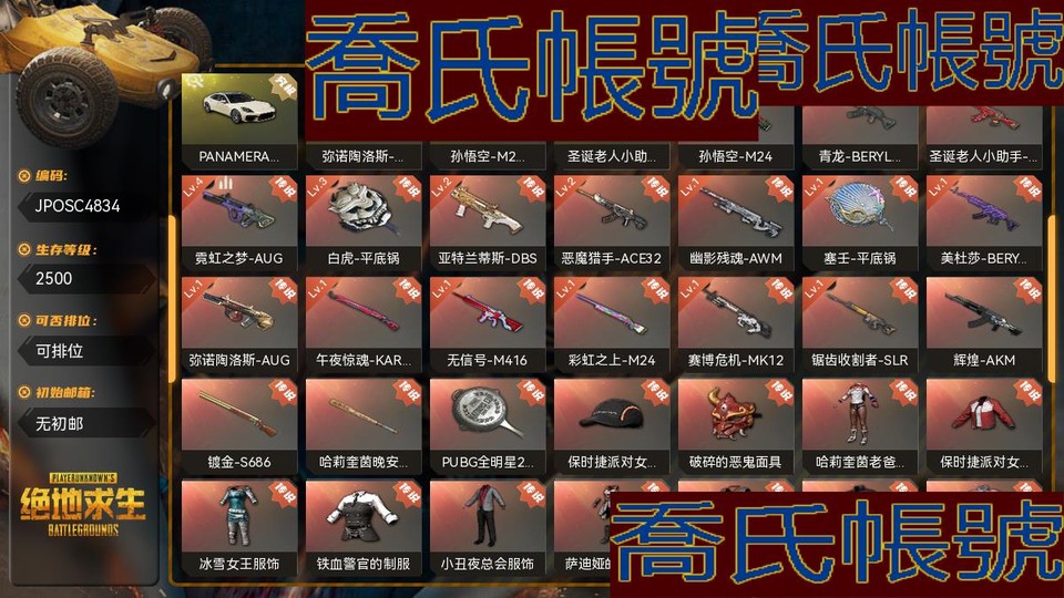 【OBJPOSC483442】生存等級2500;異色皮膚3;成長型武器16;槍皮236;載具43;熱門物品:PGC2021群雄逐鹿面具,耳機漁夫帽;異色皮膚:彌諾陶洛斯-AUG灰色配棕褐色,孫悟空-M24暗紅色配金色,聖誕老人小助手AKM紅色配藍綠色;成長型武器:LV10孫悟空-M24,LV9青龍-BERYLM762,LV6聖誕老人小助手-AKM,LV4霓虹之夢-AUG,LV3白虎-平底鍋,LV2亞特蘭蒂斯-DBS,LV2惡魔獵手-ACE32,LV1幽影殘魂-AWM,LV1塞壬-平底鍋,LV1美杜莎-BERYLM762,LV1彌諾陶洛斯-AUG,LV1午夜驚魂-KAR98K,LV1無訊號-M416,LV1彩虹之上-M24,LV1賽博危機-MK12,LV1鋸齒收割者-SLR;傳說武器:彌諾陶洛斯-AUG,美杜莎-BERYLM762,惡魔獵手-ACE32,無訊號-M416,聖誕老人小助手-AKM,霓虹之夢-AUG,青龍-BERYLM762,輝煌-AKM,賽博危機-MK12,鋸齒收割者-SLR,彩虹之上-M24,幽影殘魂-AWM,午夜驚魂-KAR98K,孫悟空-M24,亞特蘭蒂斯-DBS,鍍金-S686,塞壬-平底鍋,哈莉奎茵晚安棒球棒,白虎-平底鍋,PUBG全明星2019平底鍋;傳說時裝:保時捷派對女王帽子,破碎的惡鬼面具,哈莉奎茵老爸的小怪物服飾,保時捷派對女王夾克,冰雪女王服飾,鐵血警官的制服,小丑夜總會服飾,薩迪婭的戰鬥服,緊身連衣裙灰色,朱莉的夾克,維納斯俱樂部服飾,冰雪女王夾克,PGC2022斑斕危機披風,PGC2022戰術科技夾克,朱莉的潛行者夾克,花卉印花裙,格紋裙法蘭絨灰,迷霧追蹤者短褲,精緻鞋與絲襪黑色,檢察官絲襪與靴子,絲襪與校園風鞋子黑色;載具:PANAMERATURBOS轎車,911CARRERAGTS跑車,ROADSTER奢華版跑車,DBX707SUV,PCS2戰術扭矩雙人越野車,公路戰士恣馬,8號賽手摩託艇,CAYENNETURBOGTSUV,URUSSSUV,V12VANTAGEROADSTER跑車,逃亡SUV,PGC2019達西亞轎車,ELSOLITARIO沙漠之狼,生性狂野摩托車,彩繪髏摩托車,雙龍會摩托車,加塔爾越野賽越野摩托車,金龍獻瑞越野摩托車,PCS4黃金氣魄摩托車,鳳皇來儀摩托車,加塔爾越野賽摩托車,泰索尼克達西亞轎車,彩虹四溢達西亞轎車,為你瘋狂庫佩RB,間諜軟體烏阿斯吉普車,彈球機雙人越野車,金色烈焰達西亞轎車,速度與金毛庫佩RB,專業守衛烏阿斯吉普車,彩色標記達西亞轎車,PGC2021群雄逐鹿烏阿斯吉普車,PCS5烏阿斯吉普車,計程車達西亞轎車,毒蛇獵手兩棲裝甲車,界限粉碎者恣馬,角鯊隊隊車迷你巴士,畫素風大冒險羅尼,賽季10競技肌肉跑車,碰撞測試皮卡車,PGI.S洪波湧起達西亞轎車,聖誕快樂烏阿斯吉普車,嬉皮士之魂摩託艇,飛得更高動力滑翔機;史詩武器:沙悟淨-AUG,愉悅的綠松色-M16A4,PGC2022王牌登場GROZA,鯊魚咬痕-M16A4,唐三藏-SLR,黑暗深淵-MINI14,週六攪局者-MK12,蜂刺-SLR,襪中好禮-SLR,霓虹之夢-MINI14,PGC2022王牌登場-SLR,美杜莎-KAR98K,G-DRAG0N-M24,愉悅的綠松色-KAR98K,蒸汽計量表-KAR98K,珍珠王朝-AWM,瘋狂收割者-M24,輝煌-UMP,無訊號-S12K,鍍金-S12K,暗黑斷罪之劍,藍色煙霧彈,橘色煙霧彈,天藍色煙霧彈;史詩時裝:聖誕老人鬍鬚,林影潛行帽子,PNC2023開拓者墨鏡,雪色美人帽,雪域面罩,特種女電視人頭套,監控人頭套,亡靈律動帽子,萬壽菊狂歡發帶,聖誕之子針織帽,雪色美人耳環,冰雪女王護目鏡,PGC2023帝皇的荊棘面具,惡魔騎手面罩,惡魔騎手椅角,極限追逐者面具,位元組意志面具,棉花蕾絲絨帽,卡通襲擊者針織帽,孫悟空的墨鏡,沙悟淨的面具,馬蹄鐵型小鬍子,PGC2019頭飾,PGC2019眼鏡,聖誕馬臉面具,榮都學者眼鏡,人類獵手制服,沙灘作戰部隊水桶,劫掠者面具,幸運怪盜面具,絲襪頭套,沙漠騙徒護目鏡,黑猩猩頭套,PCS2隱形生存者面巾,迷霧追蹤者口罩,朱莉的墨鏡,玄武眼鏡,PGC2022斑斕危機墨鏡,PGC2022戰術科技面罩,尋路者盲人眼鏡,PGC2021金墨點染鴨舌帽,PGC2021群雄逐鹿面具,PGI.S戰術貝雷帽,PNC2023開拓者上衣,雪色美人連衣裙,雪域夾克,冬夢女孩T恤,午夜祭典上衣,萬壽菊狂歡連衣裙,聖誕之子夾克,PGC2023帝皇的風衣,無重力中型上衣,惡魔騎手上衣,海軍軍官制服外套,朋克預備生毛衣,聚星女士的服飾,孫悟空的上衣,沙悟淨的長袖T恤,巨龍之母服飾,賽博生存者上衣,龍之女皇服飾,禁忌閃光旗袍,騎師夾克,蓄勢待發旗袍,阿斯頓馬丁夾克,沙灘寶貝操作員上衣,劫掠者洋裙,沙漠騙徒上衣,大麻煩胸衣,青龍夾克,迷霧追蹤者上衣,白虎上衣,PGC2022斑斕危機上衣,PGC2022戰術科技上衣,PGC2021金墨點染襯衫,PGC2021金墨點染皮質連衣裙,維娜託水手衫,牛仔響尾蛇夾克,林影潛行外套,PNC2023開拓者夾克,亡靈律動夾克,惡魔騎手夾克,聚星女士的夾克,位元組意志夾克,孫悟空的夾克,沙悟淨的夾克,PGC2019戰術連帽衛衣,禁忌閃光夾克,神槍手戰術護肩外套,沙漠騙徒風衣,大麻煩夾克綠色,迷霧追蹤者夾克,玄武夾克,白虎夾克,PGC2021群雄逐鹿風衣,PGC2021群雄逐鹿短款夾克,朱莉的褐灣制服,PGL.S戰術連帽衛衣,保時捷派對女王短裙,正統朋克短褲,PNC2023開拓者長褲,冰魔長褲,PGC2023帝皇的馬褲,無重力中型長褲,惡魔騎手長褲,孫悟空的長褲,沙悟淨的短褲,PGC2019戰鬥長褲,賽博生存者長褲,沙灘寶貝短褲,沙漠騙徒長褲,青龍長褲,玄武長褲,白虎短裙,PGC2022斑斕危機長褲,PGC2022戰術科技長褲,PGC2021金墨點染長褲,維娜託短裙,牛仔響尾蛇長靴,保時捷派對女王運動鞋,雪色美人短靴,冰雪女王長靴,PNC2023開拓者運動鞋,惡魔騎手短靴,朋克預備生短靴,孫悟空的運動鞋,沙悟淨的運動鞋,PGC2019運動鞋,賽博生存者短靴,蓄勢待發長襪配皮鞋,夏日泳裝腳蹼,劫掠者長靴,沙漠騙徒短靴,青龍短靴,朱莉的靴子,PGC2022斑斕危機便鞋,PGC2022戰術科技短靴,PGC2021金墨點染短靴,PGC2021群雄逐鹿絲襪配短靴,維納斯俱樂部絲襪配長靴,維娜託短靴,PGI.S戰術短