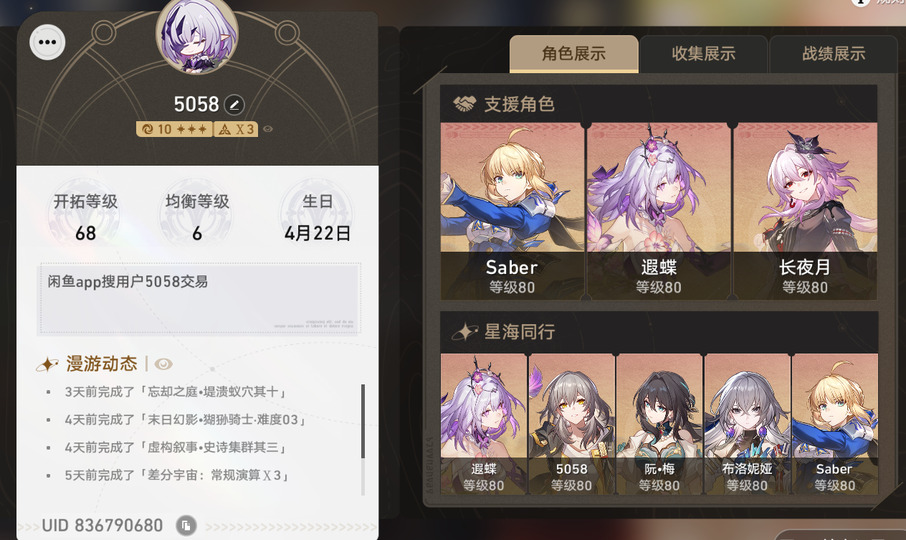*账户详情:女开拓者,等级68。用户名未设置,生日已设置
