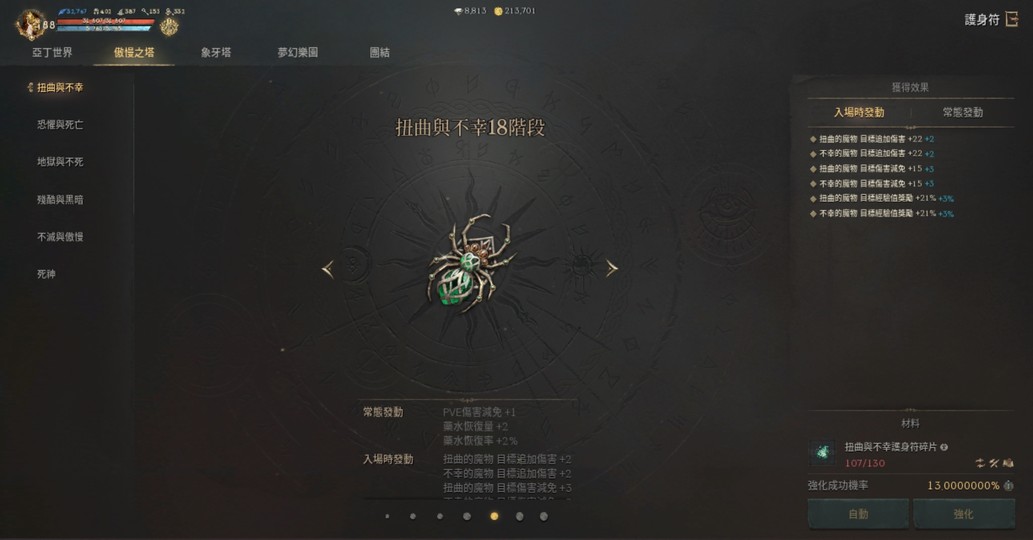 亞丁世界(17階)、扭曲不幸(17階)、恐懼死亡(17階)、地獄不死(15階)、殘酷黑暗(15階)、不滅傲慢(14階)、死神(0階)、象牙塔(18階)、夢幻樂團(13階)、活動團結(0階)
