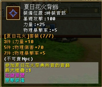 【背部】背飾: 物傷 +100、力量 +25、物爆 +5