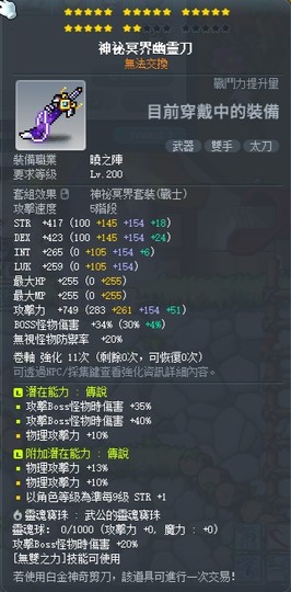 【神祕冥界幽靈刀】22星 75B10物 附加23%物每9級STR+1 有武功20B 均14攻 含刀