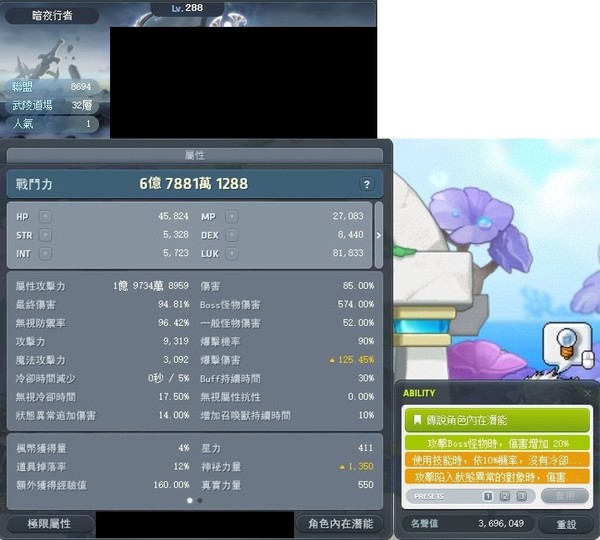 6D 288 暗夜 戰鬥力約 6E5000W (圖上有活動buff)