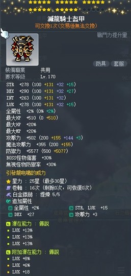 【25C 滅龍 雙傳 58%幸 頂淺能】25星 滅龍騎士盔甲 頂淺能 雙傳說 58%幸 6排 B卷軸 25星滅龍