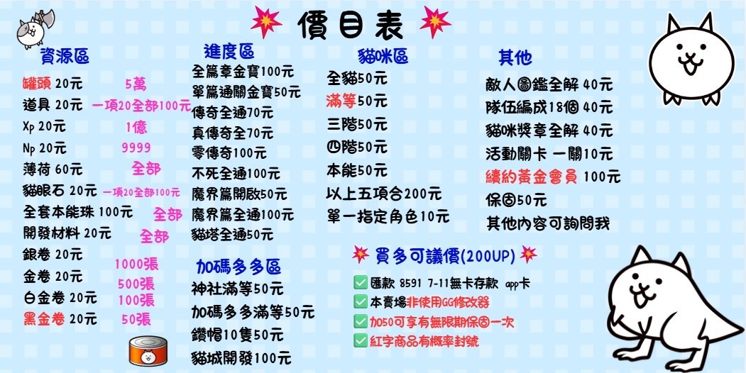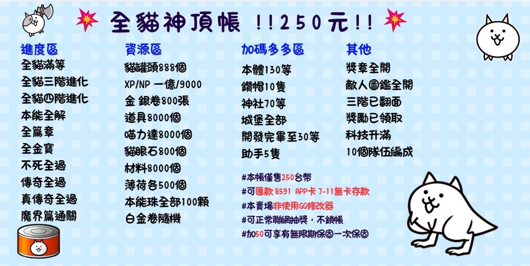 在本商場購買的遊戲帳號,自購買日起7天內,若因非買家自身行為(如被盜或被鎖,需提供相關證明),可選擇商場內相同價格(如有折扣則按折後價格計算)的帳號進行補償 需提供的證明 包括但不限於:遊戲官方鎖帳通知截圖、交易記錄、異常登入紀錄等若商場內無相同價格帳號.可選擇較低價格帳號,或補足差額選擇較高價格帳號若發現帳號因以下行為導致封鎖或遺失,將不提供補償: 共享帳號或與他人共用導致帳號異常使用外掛、違規程式或違反遊戲規則私自更改帳號資料導致無法登入 購買後7天內,如因上述原因導致帳號問題,恕不補償 購買後超過7天,因個人疏忽導致的任何問題(如被盜、遺失、封鎖),本商場不負責,請妥善保管帳號