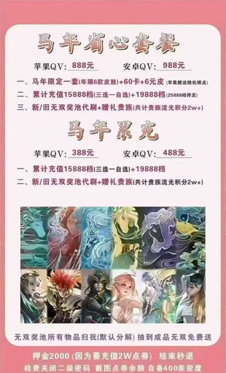 馬年省心套餐:刷累充套餐+6套年限皮膚。