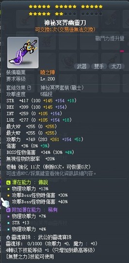 武器主職用潛:70%BOSS13%物攻(次頂職業主流主潛能 對等80%BOSS10%物攻)