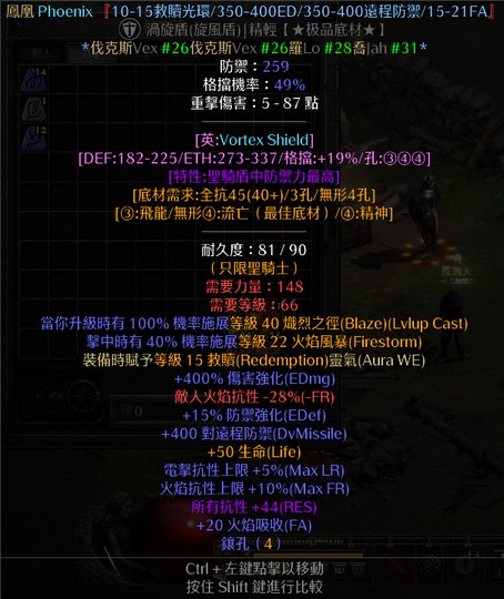 非天梯售400/400/15/20鳳凰聖騎漩渦盾 超稀有3完美的