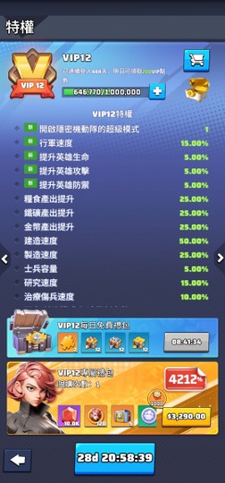 32等 VIP12級 或持續遊玩或儲值 主城 VIP 鑽石 等級 資源都會有變動