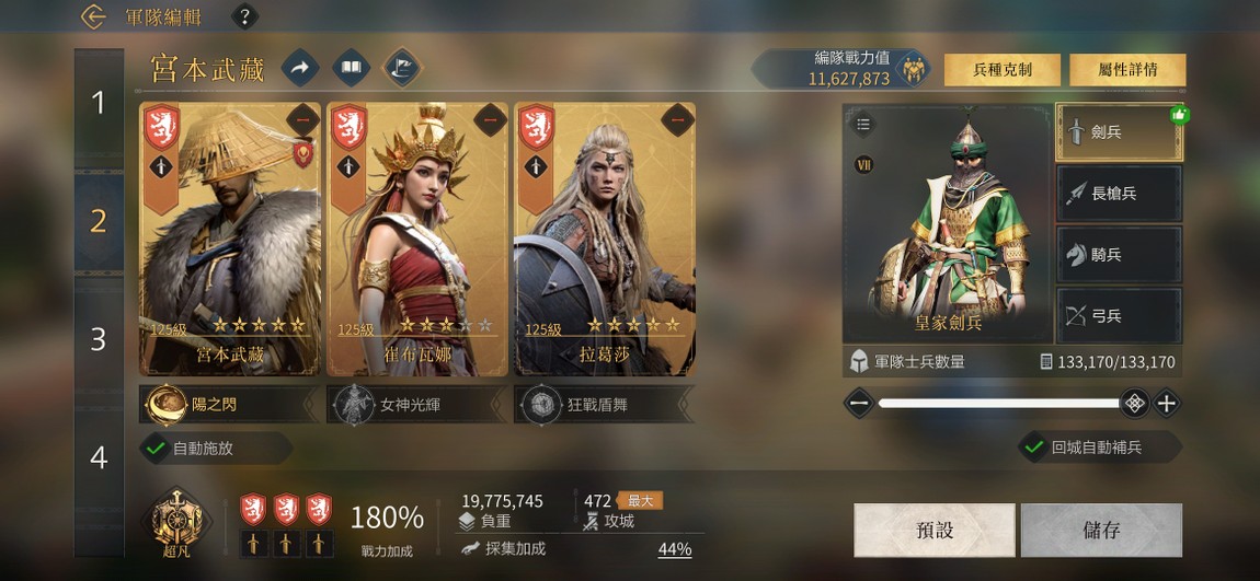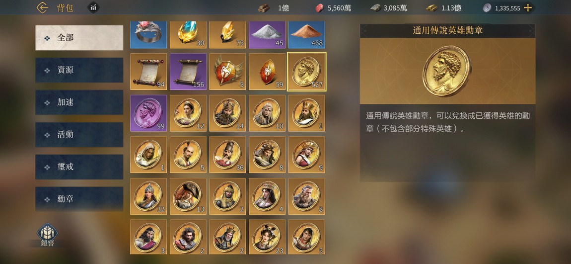 資源:帝國幣有130萬;金頭536個,大約可以養滿3-4支角色。