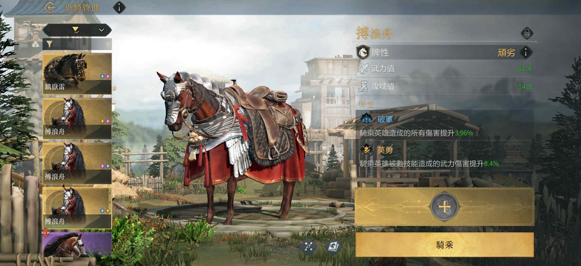 馬匹:呂布紅沸血+連戰;隕鋼還有338個,可以抽出副隊的掛飾。養了蠻多雙特性的好馬。