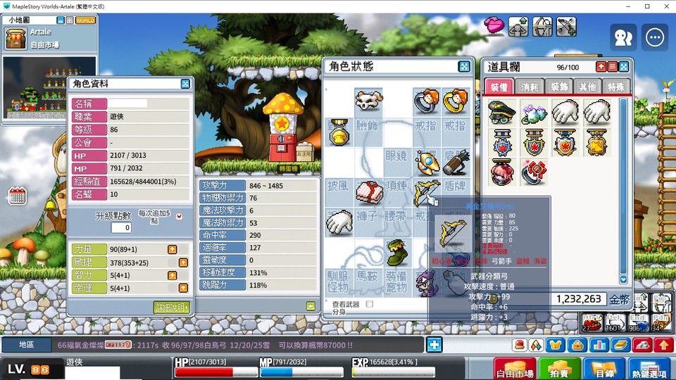 【86等、遊俠_箭神】艾倫弓+6 攻表1485 有寵物123 有造型券 100萬 不議價