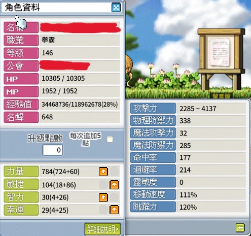 目前147等 高表 裝備不錯 差一等閃爆破就點滿 練功打王全能 持續提升中