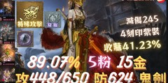 以下數值隨活動變動 【素質】:血量54,128、攻/命450/650、防/魔防624/531、減傷/PVP減傷245/64、暈命/抗暈51/164% 【粉變】: 2【烏爾坎/吉克】(合成18/20) 【變身】: 7+1金、19紫【變身收藏】: 收集卡片(79.28%)、完成收藏品(54.43%) 【變身外觀】:6紫 【粉娃】: 2+1【奧拉奇里亞/底比斯】(合成3/20) 【娃娃】: 6金、16+1紫 【娃娃收藏】: 收集卡片(72.84%)、完成收藏品(47.93%) 【娃娃外觀】: 4紫 【技能】: 1金、7紫、滿紅 【淺力】: 如影片 【咒語卡片】:如影片(收藏64.06%) 【提煉術】:加速5階、勇水5階、料理5階、魔力5階、龍珠5階、濃湯5階、戰鬥捲5階 【萬能藥水】: 萬能藥30滿,輕量1124/2705(7/10) 【奉獻石】: 神秘、根源素質如影片 【護身符】: 亞丁世界(20階)、扭曲不幸(14階)、恐懼死亡(15階)、地獄不死(16階)、殘酷黑暗(20階)、不滅傲慢(20階)、死神(3階)、象牙塔(20階)、夢幻樂團(19階)、活動團結(93階) 【魔眼】:火24滿分 【總收藏】: 41.23% 【血盟樹】:勇猛3階、守護3階、智慧0階 ※裝備可能因實際交易狀況有所變動,以交易當下確認為主 【刻印紫裝】:+5祝卡爾斗、+5祝卡爾褲、+5祝死騎靴、祝變怪項鍊 【可交易紫裝】:+7祝天鬼鬼劍、+5祝死騎頭/盔甲/手、+3祝黑靈寶珠 【刻印紅裝】:+5海賊套、+3祝/+4祝變怪戒、+2祝怨恨耳、+3祝裂痕耳、+2祝力皮帶、+2祝鬥士戒 【可交易紅裝】: 【商城裝備】:+7燦爛鬥士T/肩甲、+6閃耀奧拉面 【徽章】:+10徽章-勇猛(紫)、+10徽章-守護(紫)、+10徽章-智慧(紫) 【標幟】:+5大將軍的標幟(紫)、+5奴隸標幟(紫)、+7龍的標幟(綠) 【符石】:+4祝貫穿符石、+5祝燦爛的力量符石 【紫加護】:歐琳 【紅加護】:風龍、席琳(1)、冰女(5)、巨蟻(8) 【藍加護】:水晶(1)、地龍、火龍、水龍、仙人(0)、活動氣息(5) 【備註】:救護證書710張(可能增減) 【傲慢之塔移動符】:1-10F移動符 【寵物】:狼Lv19、杜賓狗Lv20、小獵犬Lv20 【寵物城】:管理所Lv5、宿舍Lv4、訓練場Lv6、遊樂場Lv0、圍欄Lv1 【通行證等級】: IX 【伺服器】:A區 【帳號類型】:全球區Google帳號(可改綁) 【可交易紅紫裝備】:4紫0紅裝 【空身開價】: 12W(誠可議)
