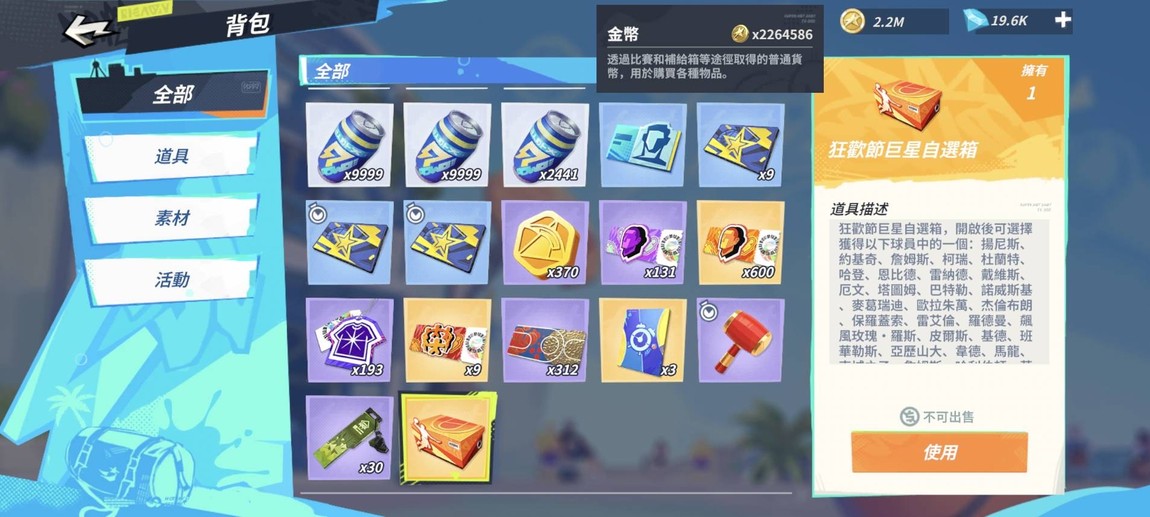 派對新秀*1,巨星球員自選箱*4(未開)、回歸時裝自選箱*1