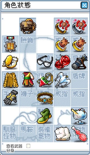 裝備如圖所示,背包未滿僅340格,屆時可幫清包包或全數移轉